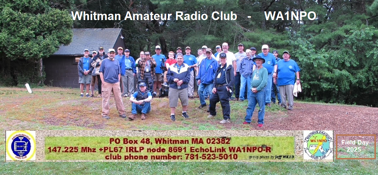 The Whitman Amateur Radio Club is located about 25 miles south of Boston, MA, near the city of Brockton. Club meetings are held the first Wednesday of each month at the Whitman Knights of Columbus Hall on route 18 just south of the Abington line. The meetings start at 7:00 PM.